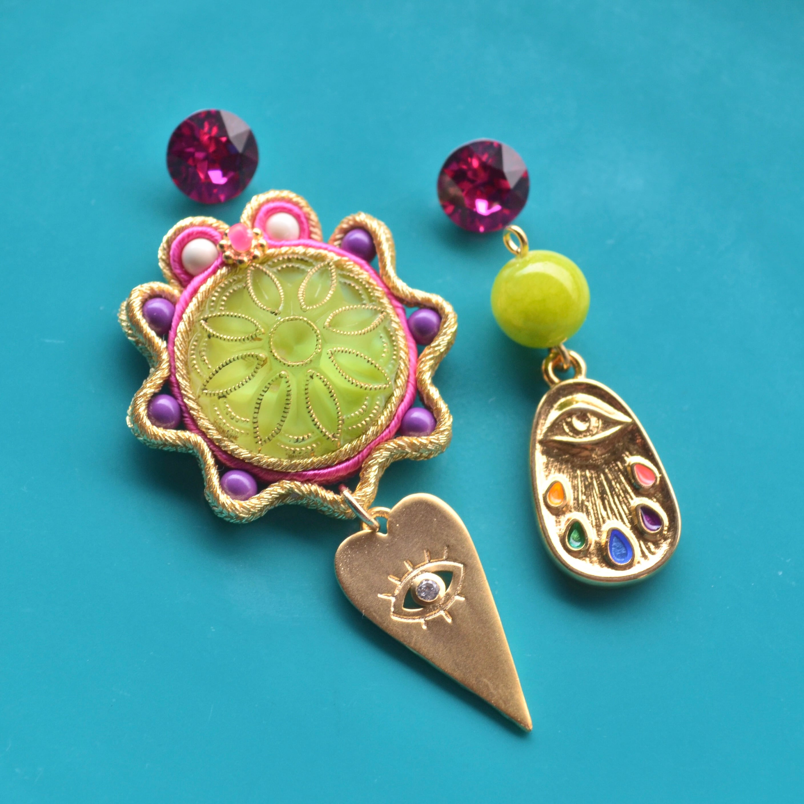 東洋のヴィンテージガラスボタンをメインに作りました。左右のインポートチャームもかわいいです。
