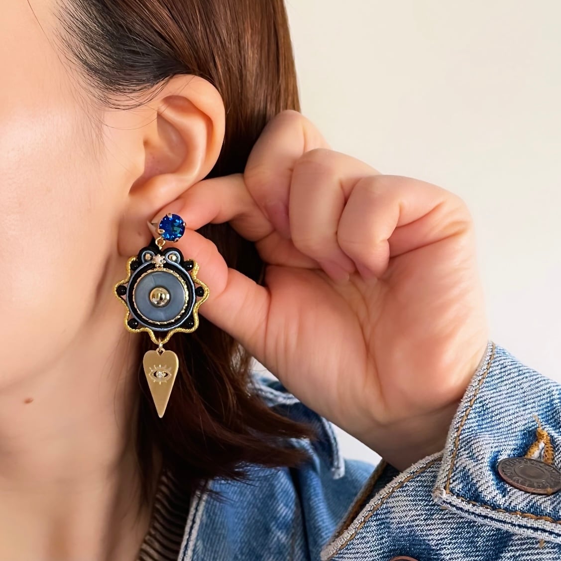 東洋のヴィンテージガラスボタンをメインに作りました。トップはマットなスワロフスキーストーンです。
