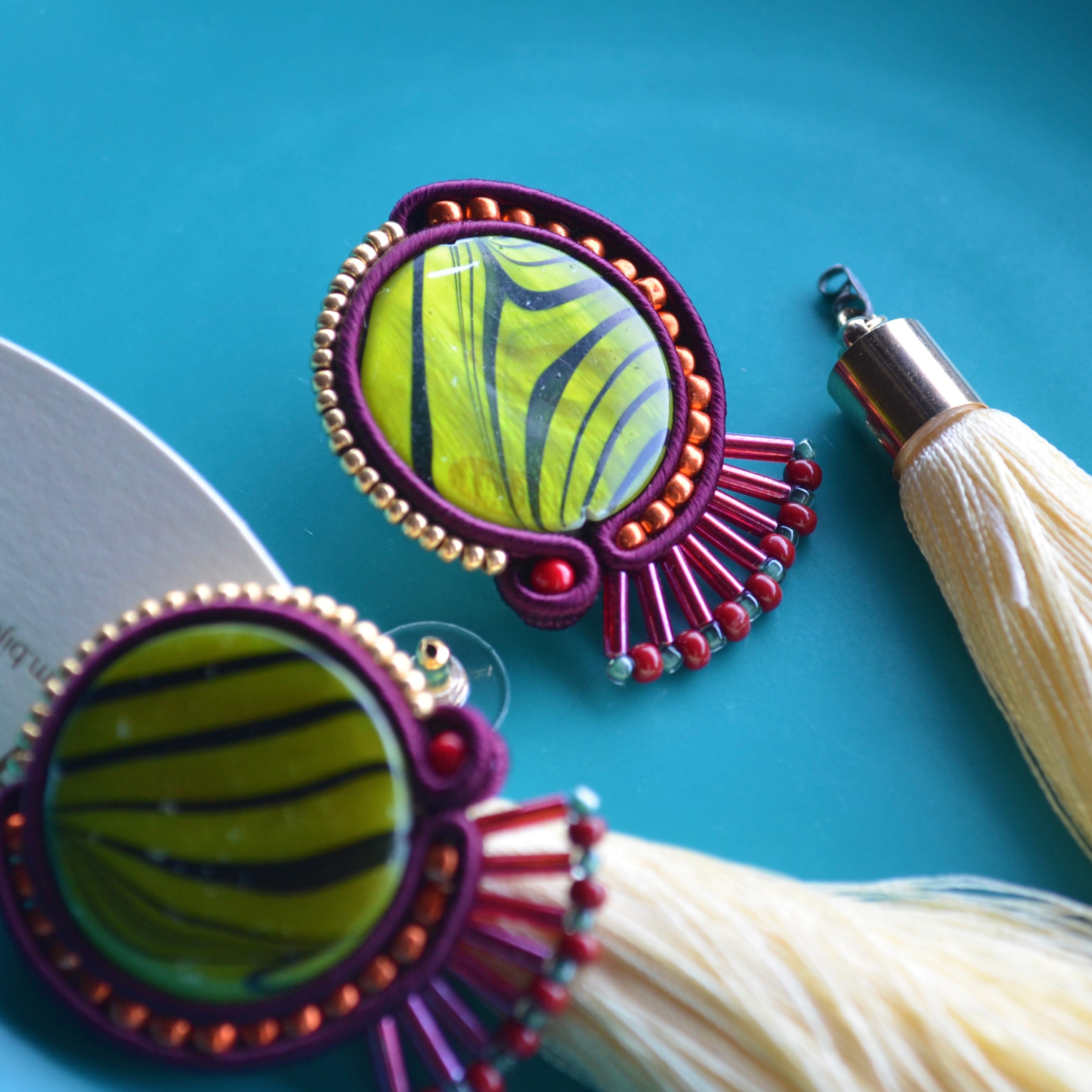インポートのゼブラ柄シェルビーズをメインに大ぶりなピアスを作りました。