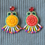 東洋のヴィンテージガラスボタンを使用した鮮やかなソウタシエです。左右1点ずつしか在庫のないかわいい色違いボタンで作りました。